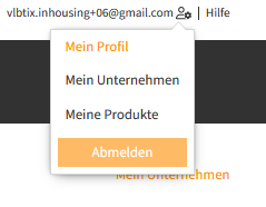 Klicken Sie oben rechts auf Ihre E-Mail-Adresse, wechseln Sie dort zwischen Mein Profil, Mein Unternehmen und Meine Produkte oder melden Sie sich ab.