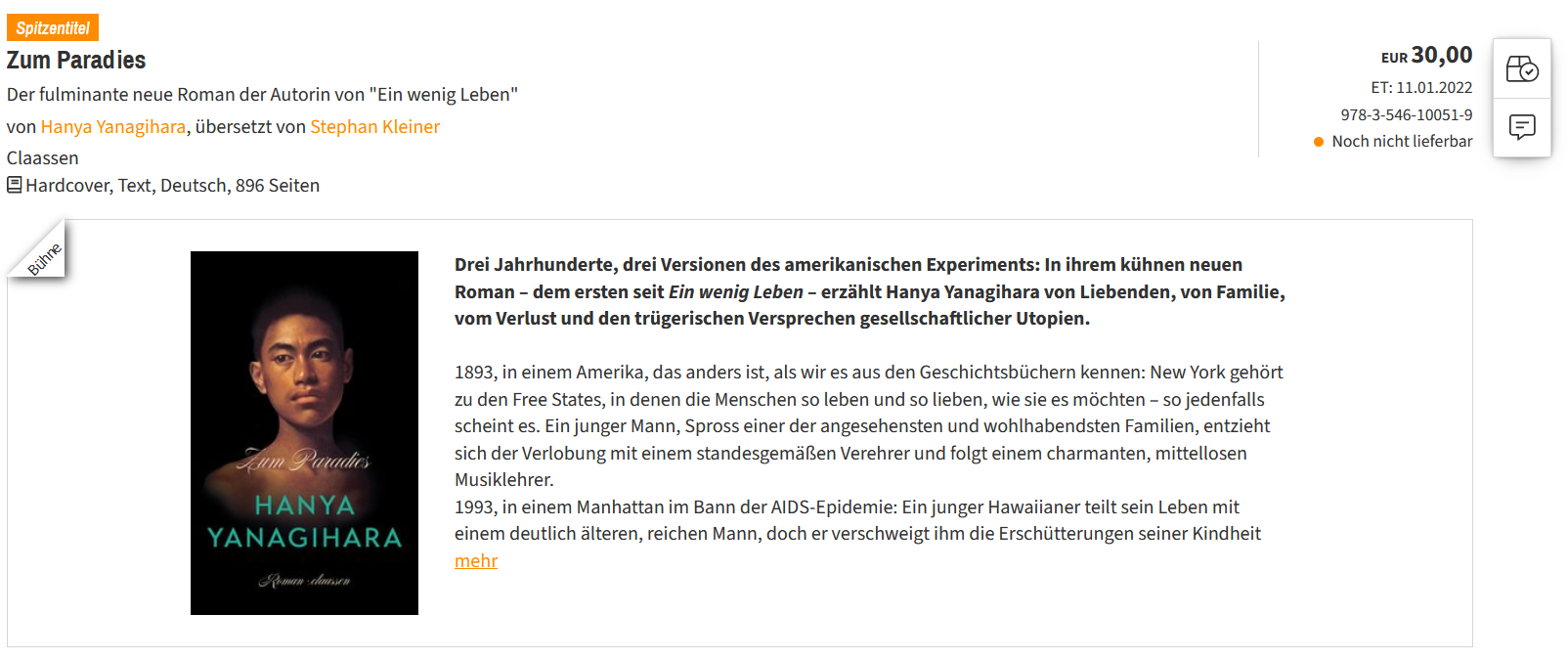 Darunter sehen Sie bibliografische Angaben und rechts den Preisblock mit Erscheinungstermin, Auslieferungstermin (wenn vorhanden), Erstverkaufstag (wenn vorhanden), ISBN und Lieferbarkeitsstatus. Diese Informationen finden Sie immer an der gleichen Stelle am Titel.