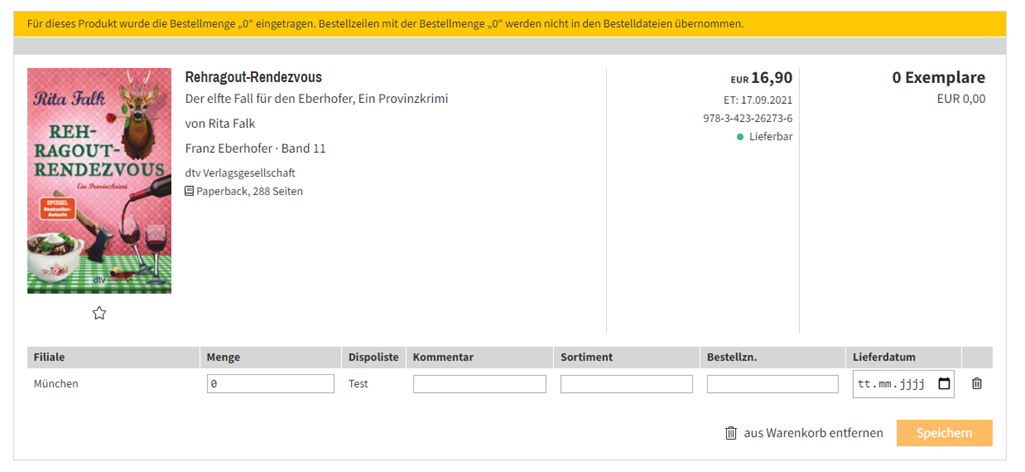 Sollten Produkte mit der Bestellmenge "0" im Warenkorb gelandet sein, werden Sie gewarnt, dass diese nicht in die Bestelldateien übernommen werden.