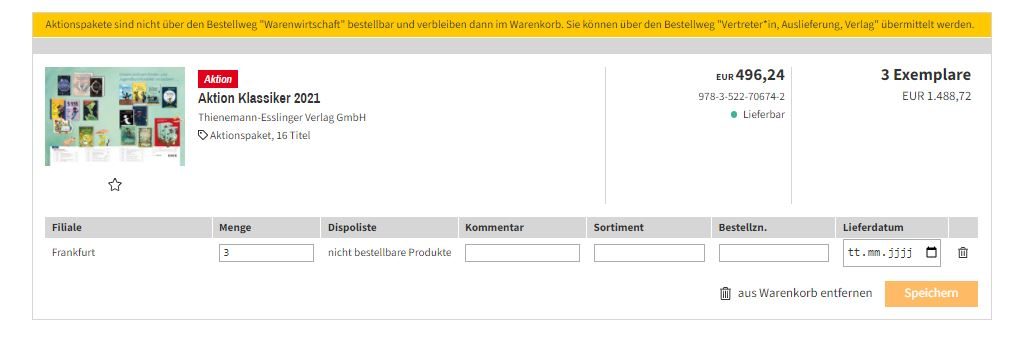 - Aktionspakete können nur über den Bestellweg Vertreter*in, Auslieferung, Verlag ausgelöst werden. Wird der Bestellweg Warenwirtschaft gewählt, verbleibt das Aktionspaket im Warenkorb.
