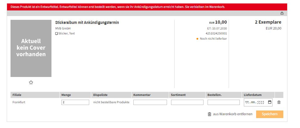 Eine rote Warnung sehen Sie, wenn ein Entwurfstitel im Warenkorb gelandet ist. Entwurfstitel können erst bestellt werden, wenn sie ihr Ankündigungsdatum erreicht haben.