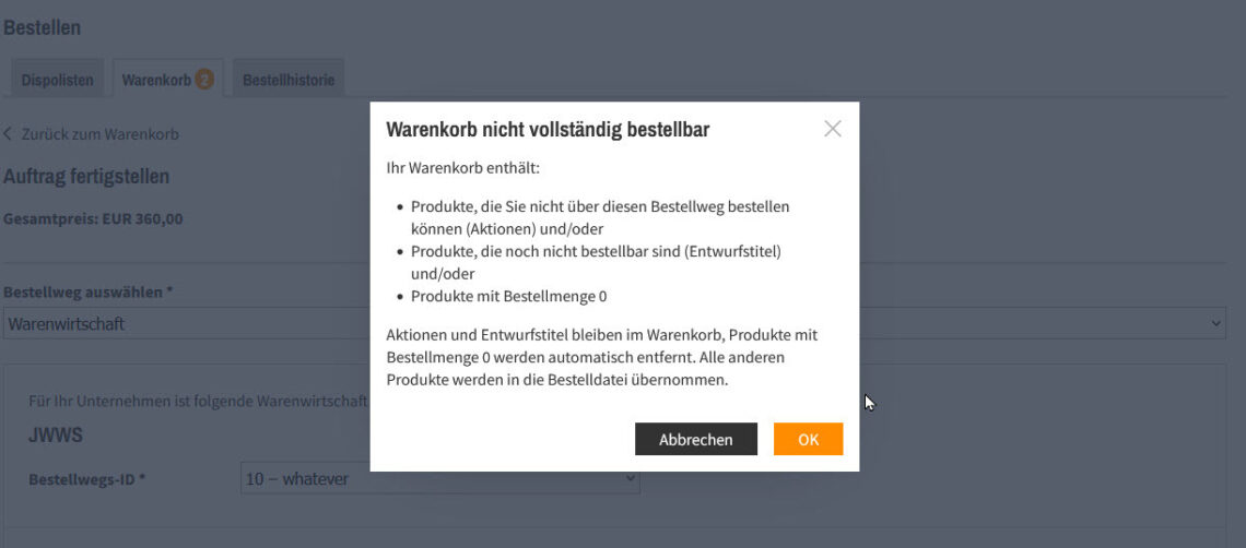 Diese Warnung taucht auf, wenn sich in Ihrem Auftrag zusätzlich zu bestellbaren Produkten auch solche befinden, die nicht bestellbar sind:
