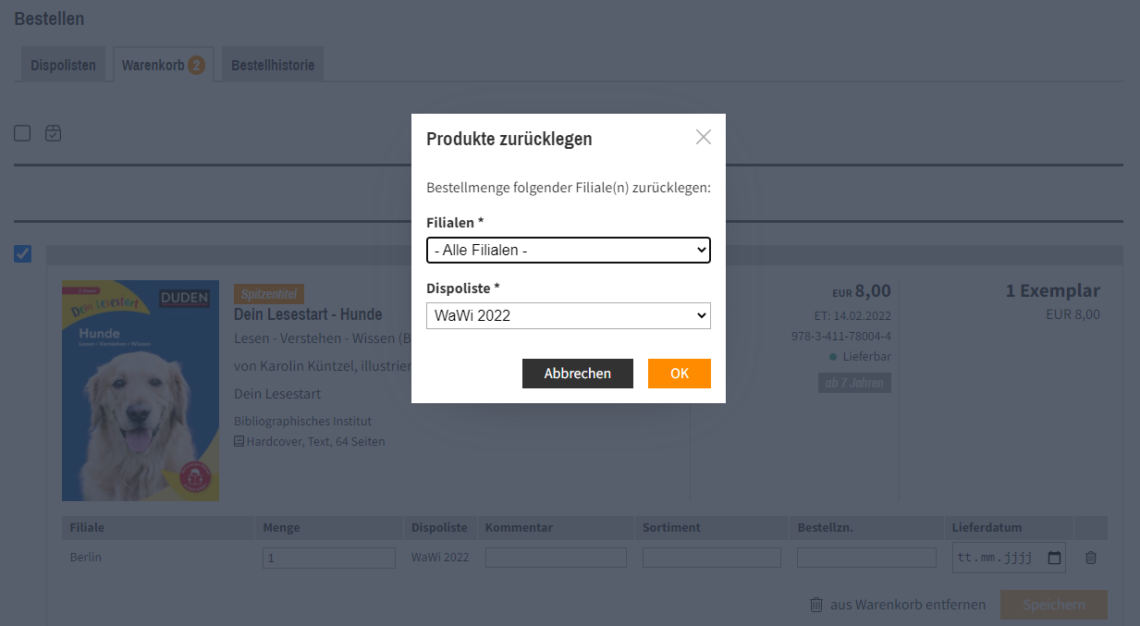 Wenn Sie Produkte versehentlich in den Warenkorb verschoben haben, können Sie diese zurück auf eine Dispoliste legen. Dazu wählen Sie die gewünschten Produkte oder alle über die entsprechenden Kästchen aus, klicken oben auf das Dispolisten-Symbol und entscheiden dann, gegebenenfalls für eine oder alle Filialen, auf welche Dispoliste die Produkte zurückgelegt werden sollen.