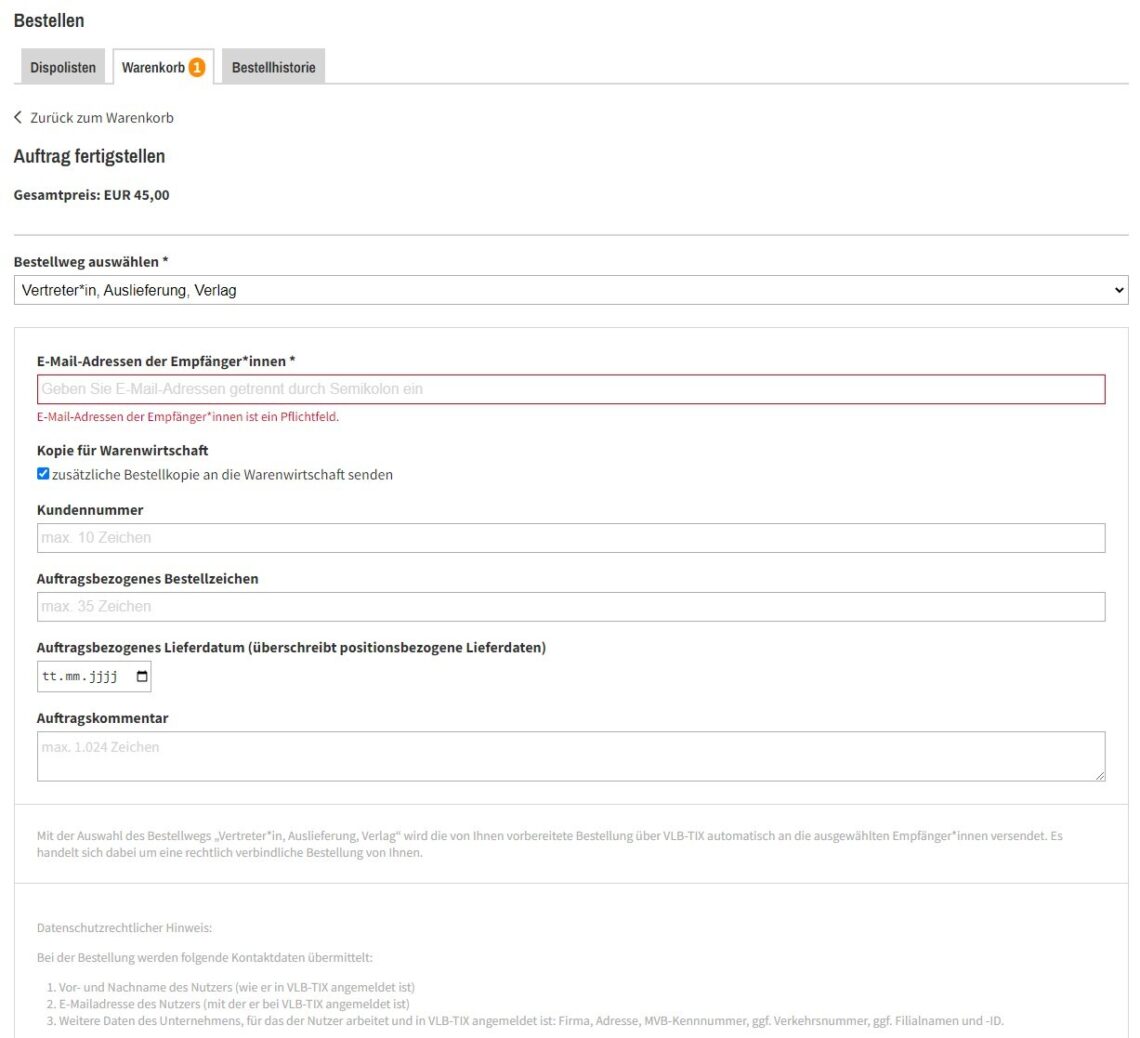 Alle Felder werden der Bestelldatei mitgegeben, aber nicht jedes Vertretersystem zeigt alle Felder an. Möchten Sie Ihrer Vertreterin oder Ihrem Vertreter Informationen oder Wünsche mitgeben, empfehlen wir daher nicht die Bestellung über den Warenkorb mit dem Bestellweg Vertreter*in, Auslieferung, Verlag und den dortigen Auftragskommentar zu nutzen.