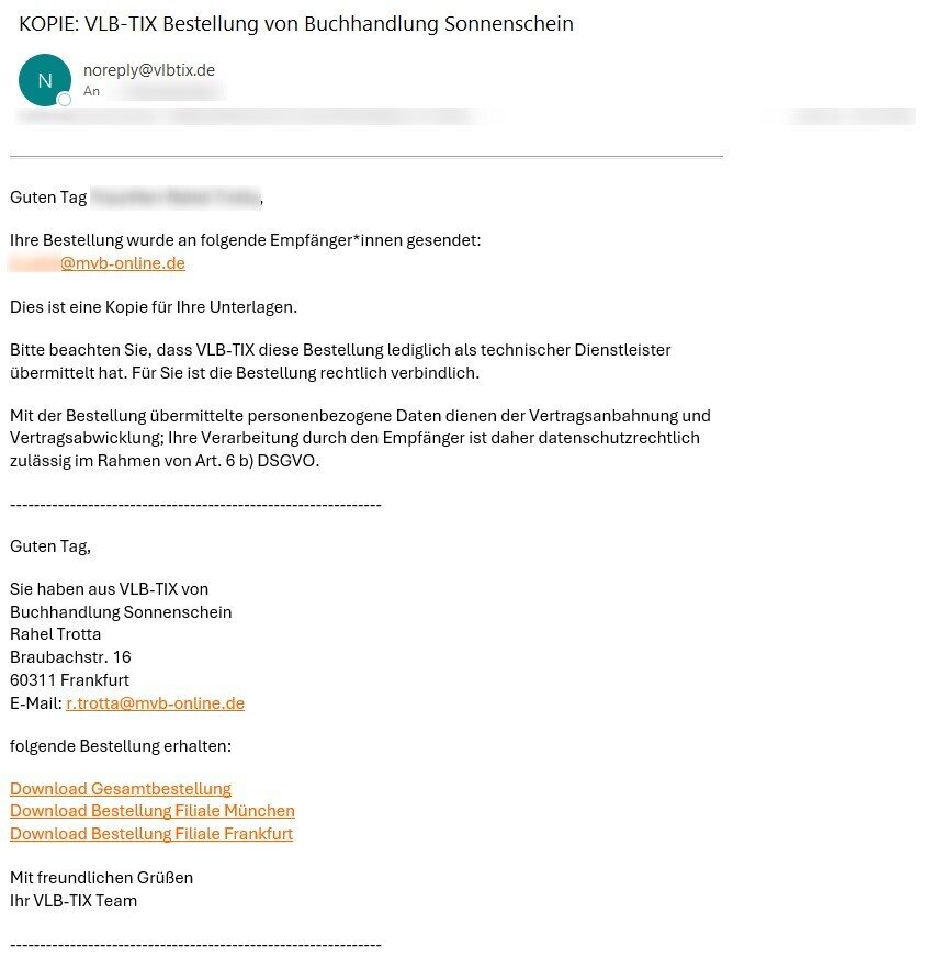 Ihre Bestellung wird nun an die angegebene(n) E-Mail-Adresse(n) weitergeleitet. Sie erhalten automatisch eine Kopie an die E-Mailadresse, mit der Sie in VLB-TIX eingeloggt sind und, wenn ausgewählt, wird eine Bestellkopie an Ihre Warenwirtschaft weitergeleitet.