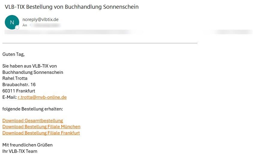 Die aus VLB-TIX versendete E-Mail für Vertreter*in, Auslieferung, Verlag enthält die benötigten Informationen zu Ihrer Buchhandlung sowie die Bestelldaten zum Download. Wenn Sie in VLB-TIX eigene Filialen hinterlegt haben, stehen für die Empfängerinnen und Empfänger unterschiedliche Varianten zum Download zur Verfügung: