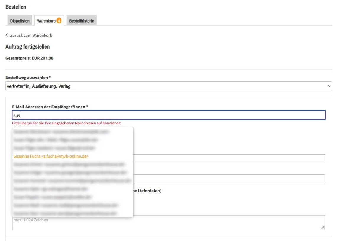 - Füllen Sie das Pflichtfeld E-Mail-Adressen der Empfänger*innen und, wenn gewünscht, weitere Felder aus. Mit Eingabe der ersten Buchstaben des Namens bzw. der E-Mail-Adresse erhalten Sie Vorschläge zur Auswahl, sofern Ihre Vertreterin oder Ihr Vertreter mit der entsprechenden E-Mail-Adresse in VLB-TIX hinterlegt ist.
