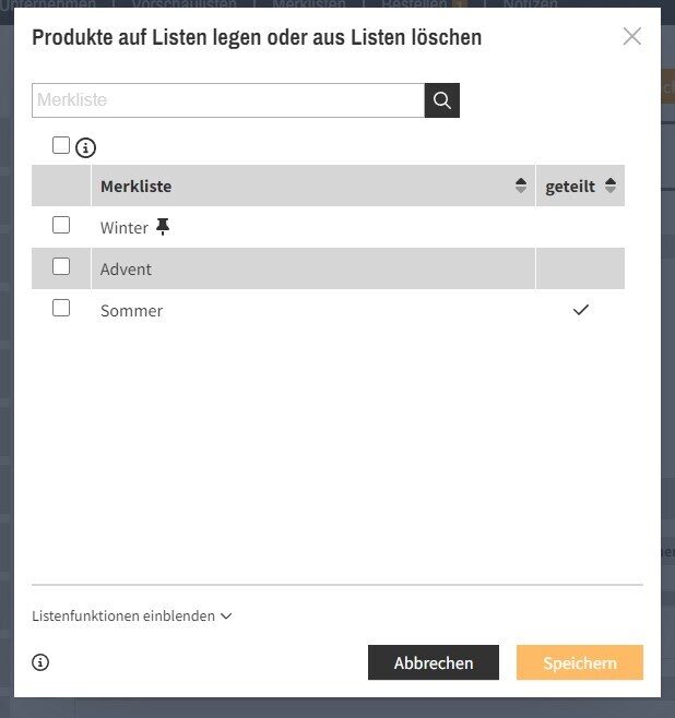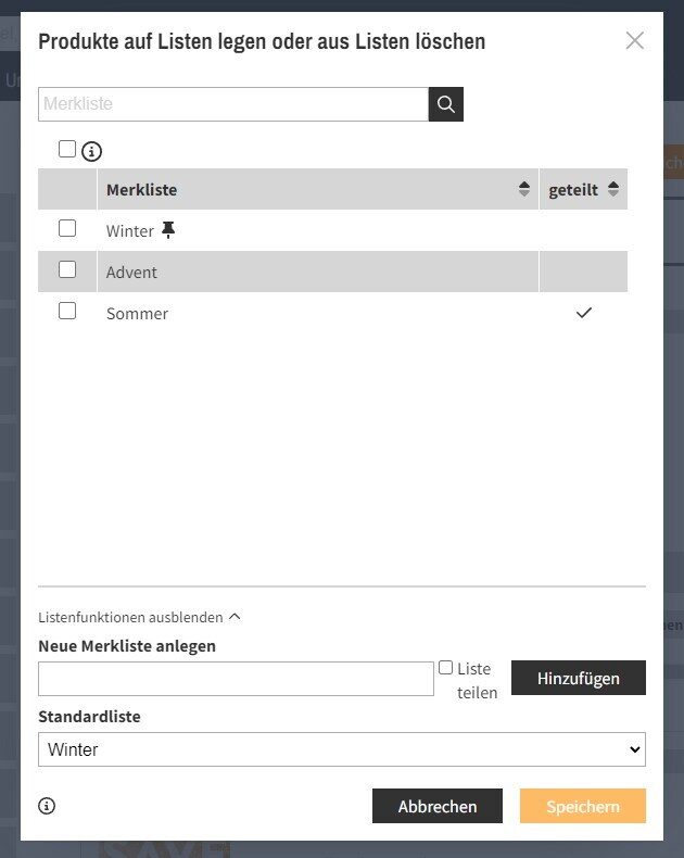 Per Klick auf Listenfunktionen einblenden öffnet sich ein weiterer Bereich. Dort legen Sie direkt eine neue Merkliste an und entscheiden, ob Sie diese Liste auch teilen oder als Ihre Standardliste auswählen wollen. Nach Klick auf Speichern sind die Produkte entsprechend auf der (neuen) Merkliste abgelegt.