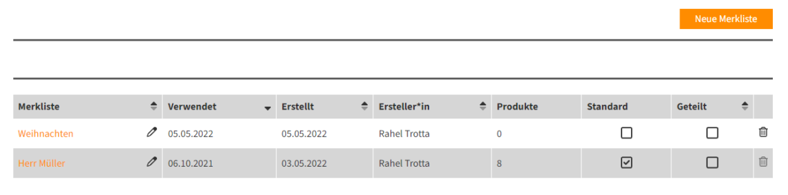 - einen Mülleimer, mit dem Sie die entsprechende Merkliste löschen, wenn sie aktuell weder eine Standardmerkliste noch geteilt ist