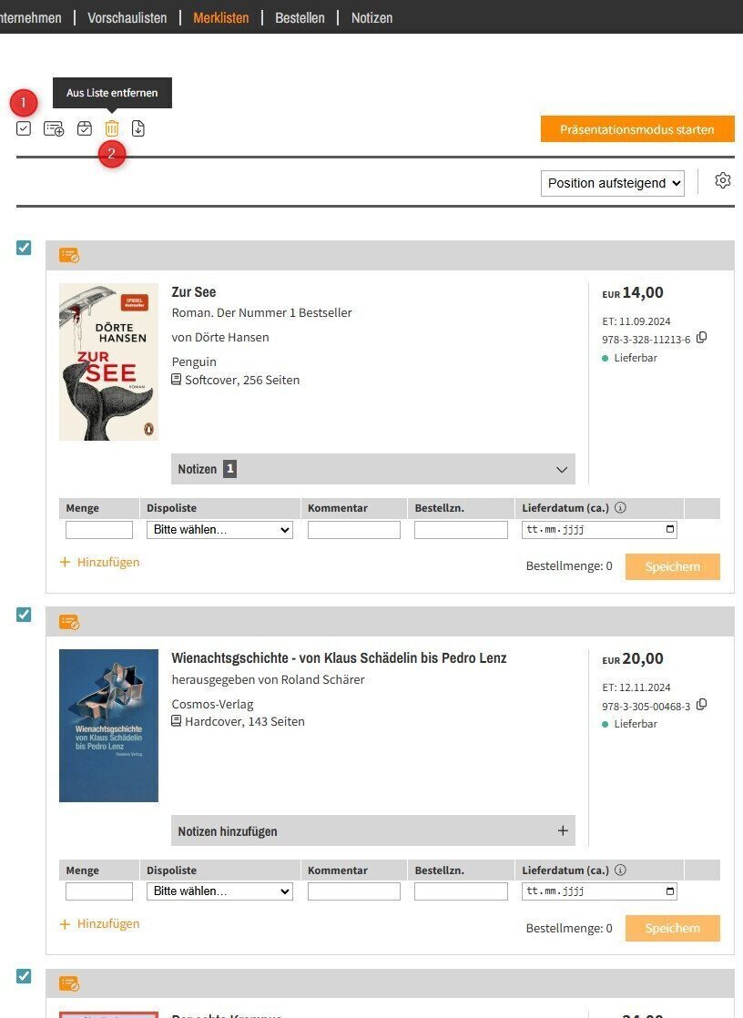 Sie können auch Produkte von Merklisten löschen, die Ihre Kollegen auf eine geteilte Merkliste gelegt haben.