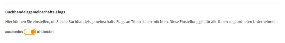 3. einzustellen, ob Sie die Buchhandelsgemeinschafts-Flags an Titeln ein- oder ausblenden möchten, wenn Sie als Buchhandlung einer Buchhandelsgemeinschaft angehören. Diese Einstellung gilt für alle Ihnen zugeordneten Unternehmen.
