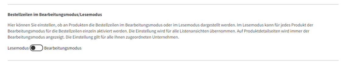 2. die Anzeige der Bestellzeilen anzupassen. Hier können Sie einstellen, ob an Produkten die Bestellzeilen im Bearbeitungsmodus oder im Lesemodus dargestellt werden sollen. Als Standard ist immer der Bearbeitungsmodus voreingestellt. Mehr dazu lesen Sie hier.