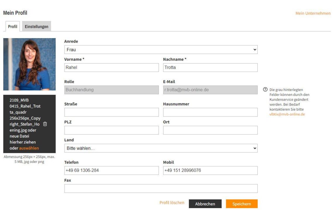 Die Profildaten setzen sich aus den Daten zusammen, die Sie bei der Registrierung angegeben haben. Die weißen Felder und das Profilbild können Sie jederzeit anpassen. Grau hinterlegte Felder können nur durch den Kundenservice geändert werden. Schreiben Sie in diesem Fall eine E-Mail an vlbtix@mvb-online.