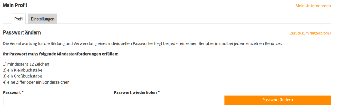Neben der Eingabe, Korrektur und Vervollständigung Ihrer allgemeinen Profileinstellungen ändern Sie an dieser Stelle bei Bedarf Ihr Passwort. Halten Sie sich bei der Vergabe eines neuen Passwortes für den optimalen Schutz Ihrer persönlichen Daten an die Vorgaben, die wir Ihnen darüber zusammengestellt haben:
