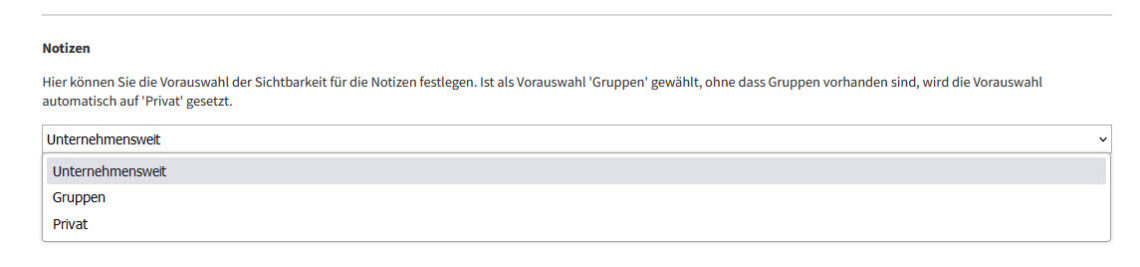 4. die Vorauswahl festzulegen, mit denen Ihre Notizen sichtbar sein sollen. Es steht unternehmensweit (für alle User des ausgewählten Unternehmens sichtbar), privat (nur für Sie sichtbar) und in Gruppen sichtbar zur Auswahl. Die hier hinterlegte Option ist für alle neuen Notizen von Ihnen standardmäßig hinterlegt, jedoch lassen sich an der jeweiligen Notiz abweichende Einstellungen vornehmen.