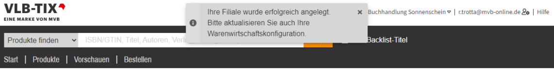 Für jede Filiale muss unter dem Reiter Warenwirtschaft jeweils eine Identifikationsnummer hinterlegt sein. Ein Hinweis bei Neuanlage einer Filiale macht Sie aber auch direkt darauf aufmerksam: "Ihre Filiale wurde erfolgreich angelegt. Bitte aktualisieren Sie auch Ihre Warenwirtschaftskonfiguration."