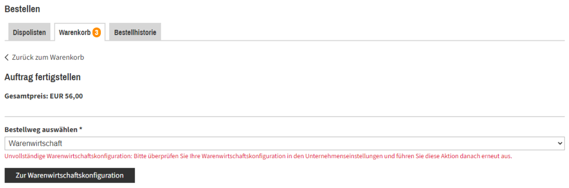 Haben Sie die Einstellungen der Warenwirtschaft nicht aktualisiert, erhalten Sie einen weiteren Hinweis, wenn Sie eine Bestellung über den Warenkorb an Ihre Warenwirtschaft versenden möchten: "Unvollständige Warenwirtschaftskonfiguration: Bitte überprüfen Sie Ihre Warenwirtschaftskonfiguration in den Unternehmenseinstellungen und führen Sie diese Aktion danach erneut aus."