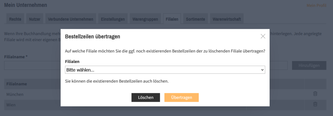 Beim Löschen einer bestehenden Filiale werden Sie gefragt, auf welche Filiale die bereits befüllten Bestellzeilen der zu löschenden Filiale übertragen oder, ob diese Bestellzeilen komplett gelöscht werden sollen.