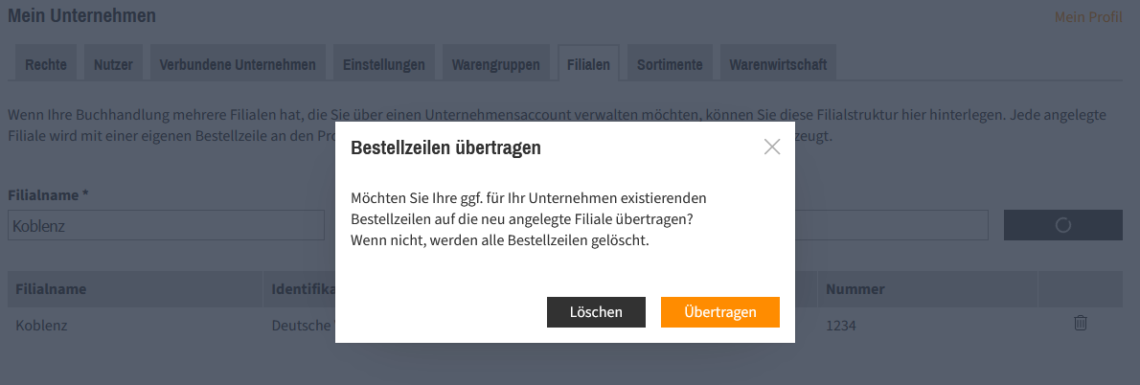 Löschen Sie die letzte Ihrer Filialen, werden Sie gefragt, ob die befüllten Bestellzeilen auf das Unternehmen übertragen oder komplett gelöscht werden sollen.