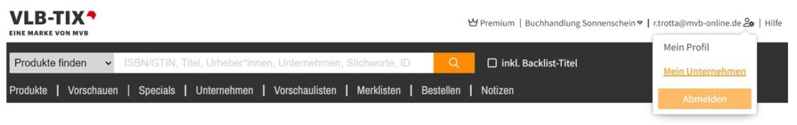 Durch Klick auf Ihre E-Mail-Adresse können Sie die Bereiche Mein Profil sowie Mein Unternehmen ansteuern. Außerdem finden Sie dort den Abmelden-Button, um sich aus VLB-TIX auszuloggen.