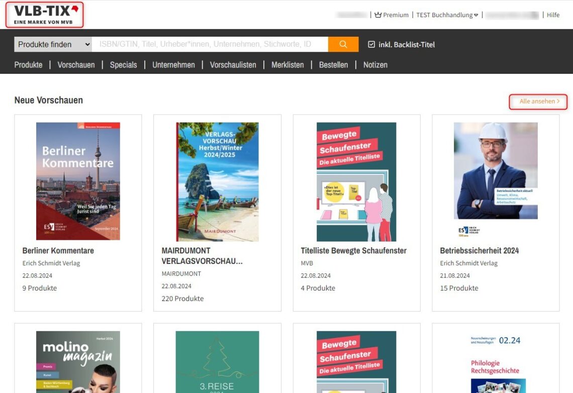 Auf der Startseite werden Ihnen als Einstieg immer die neusten freigegebenen Vorschauen angezeigt. Mit Klick auf das Cover oder den Titel der Vorschau, öffnen Sie diese direkt in der Listenansicht. Durch Klick auf Alle ansehen, wechseln Sie in den Bereich Vorschauen. Mehr zum Bereich Vorschauen lesen Sie hier.