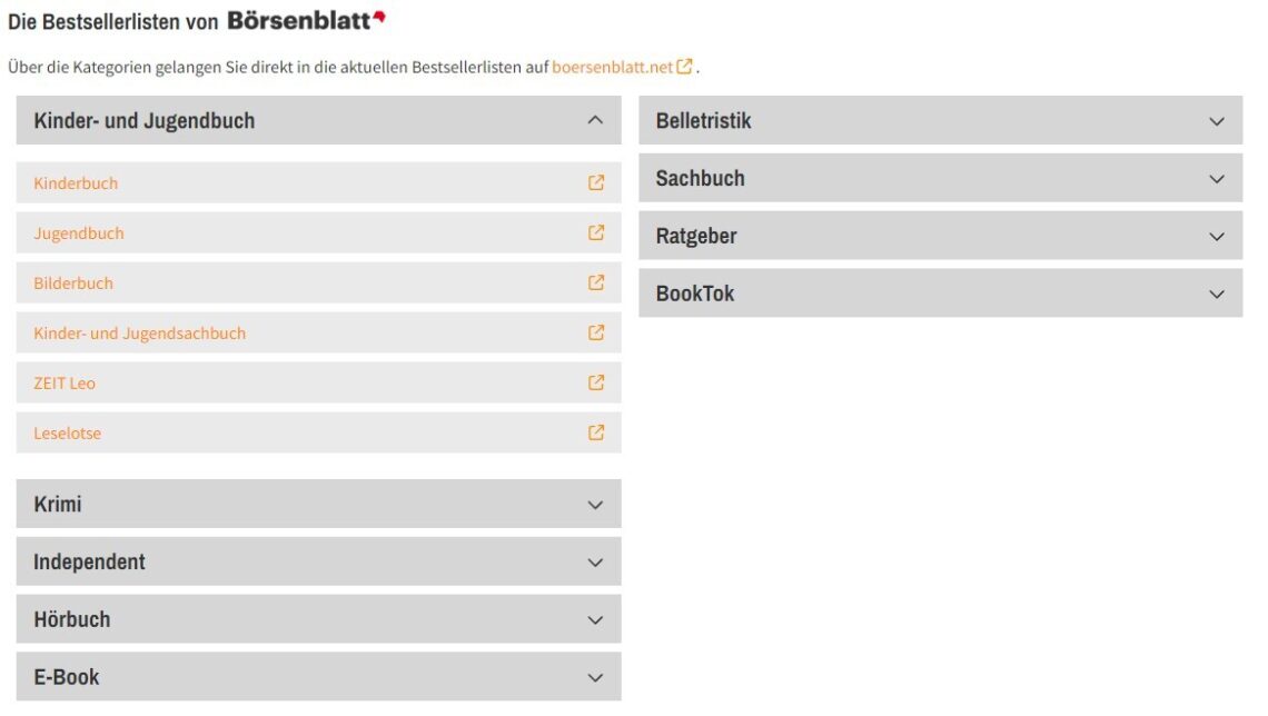 Mit Klick auf die Hauptkategorien werden die zur Verfügung stehenden Unterkategorien angezeigt. Durch anklicken der gewünschten Kategorie gelangen Sie direkt in die aktuellen Bestsellerlisten auf boersenblatt.net .
