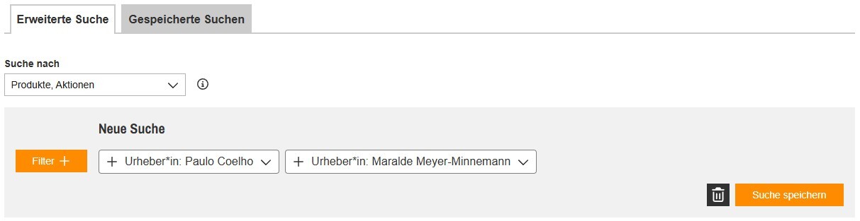 - neben den bereits bekannten Filtern aus der Produktsuche, stehen weitere Filter, die ausschließlich in der Suche+ vorhanden sind, den Nutzerinnen und Nutzern zur Verfügung: Thema-Klassifikation, Reihe, Produkte mit Werbemitteln, Produkte mit Marketing-Grafiken, Erstverkaufstag und Auslieferungstermin