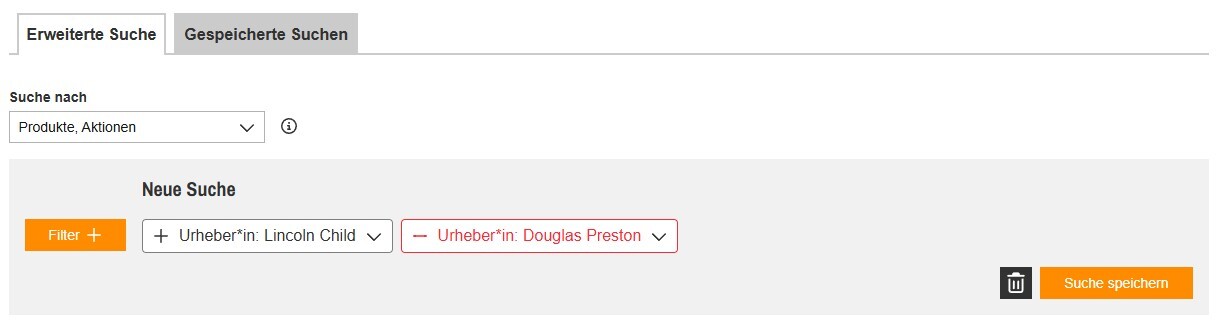 | Urheber*in | Nutzen Sie diesen Filter um Suchen nach Urheberinnen und Urhebern einzugrenzen. Der Filter durchsucht alle Arten an Urheberinnen und Urhebern (also bspw. Herausgeberinnen und Herausgeber, Sprecherinnen und Sprecher etc.). Dabei ist es unerheblich, ob Sie die Urheberinnen und Urheber komplett oder nur ein Teil des Namens eintragen, oder ob Sie einzelne oder eine Liste an Urheberinnen und Urhebern suchen. Tippen oder kopieren Sie die Daten in das Textfeld und bestätigen Sie die Eingabe mit Enter oder Mausklick außerhalb des Textfeldes. Sie können sowohl bei der Einzel-, wie auch bei der Stapelsuche Wildcards benutzen, z.B. Bag* oder entscheiden, ob die Urheberinnen und Urheber in der Suche ein- oder ausgeschlossen werden sollen. Der Filter an sich kann mehrfach ausgewählt werden, so dass der Filter automatisch zueinander mit einer UND-Verknüpfung kombiniert wird. Beispiel: Sie suchen Produkte die Gemeinsam von "Lincoln Child" und "Douglas Preston" geschrieben wurden, nutzen Sie den Filter zweimal, so werden Ihnen nur Produkte angezeigt die "Lincoln Child" UND "Douglas Preston" gemeinsam als Urheber führen. Suchen Sie beide Urheber innerhalb des Filters als Stapelsuche, so werden Produkte angezeigt die entweder von "Lincoln Child" ODER "Douglas Preston" geschrieben wurden. |