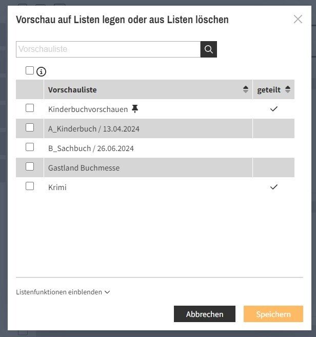 Per Klick auf Listenfunktionen einblenden öffnet sich ein weiterer Bereich. Dort legen Sie direkt eine neue Vorschauliste an und entscheiden, ob Sie diese Liste auch teilen oder als Ihre Standardliste auswählen wollen. Nach Klick auf Speichern sind die Vorschauen entsprechend auf der (neuen) Vorschauliste abgelegt.