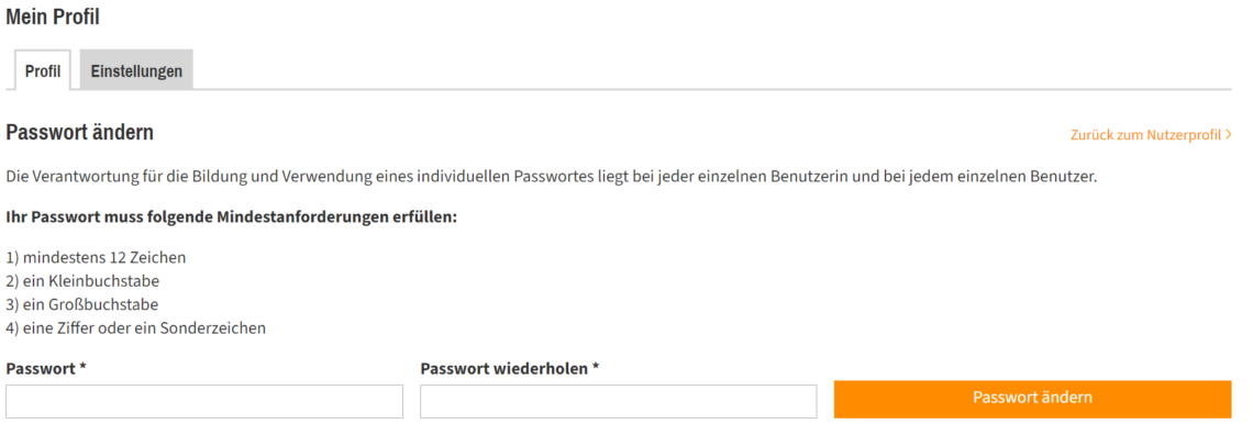 Neben der Eingabe, Korrektur und Vervollständigung Ihrer allgemeinen Profileinstellungen ändern Sie an dieser Stelle bei Bedarf Ihr Passwort. Halten Sie sich bei der Vergabe eines neuen Passwortes für den optimalen Schutz Ihrer persönlichen Daten an die Vorgaben, die wir Ihnen darüber zusammengestellt haben: