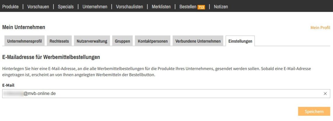Hinterlegen Sie hier eine E-Mail-Adresse, über die alle Werbemittel Ihres Unternehmens bestellt werden können. Sobald eine E-Mail-Adresse eingetragen ist, erscheint an von Ihnen angelegten Werbemitteln der Bestellbutton.