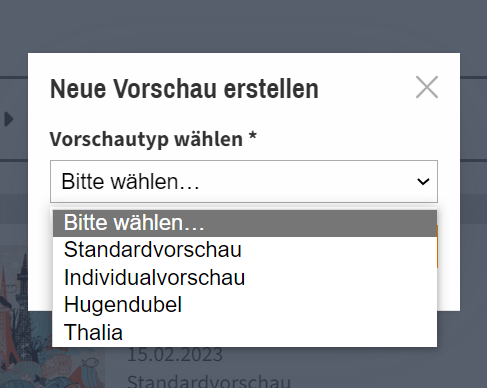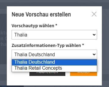 Wählen Sie hierzu bitte bei der Erstellung einer Vorschau das Drop-down-Menü Thalia aus. Über das zusätzliche Drop-down-Menü können Sie den Zusatzinformationen-Typ auswählen und so gezielt Vorschauen für die Zentrale Thalia Deutschland oder Thalia Retail Concepts erstellen.