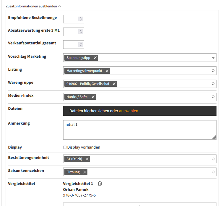 Eine Hugendubel-Vorschau ist in der Bearbeitung gleich aufgebaut wie eine Individualvorschau, nur die Zusatzinformationen, die Sie einem Produkt hinzufügen können, unterscheiden sich.