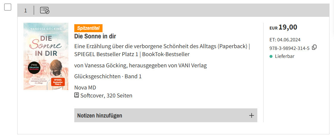 Haben Sie Ihrem Produkt Hervorhebungs-Flags zugeteilt, wie zum Beispiel Spitzentitel oder Bestseller, werden diese über dem Titel angezeigt. Wie Sie Ihre Produkte hervorheben können, lesen Sie hier. Als Verlag sehen Sie hier zusätzlich das Buchhandelsgemeinschafts-Flag, wenn das Produkt von einer oder mehreren Buchhandelsgemeinschaften ausgezeichnet wurde.