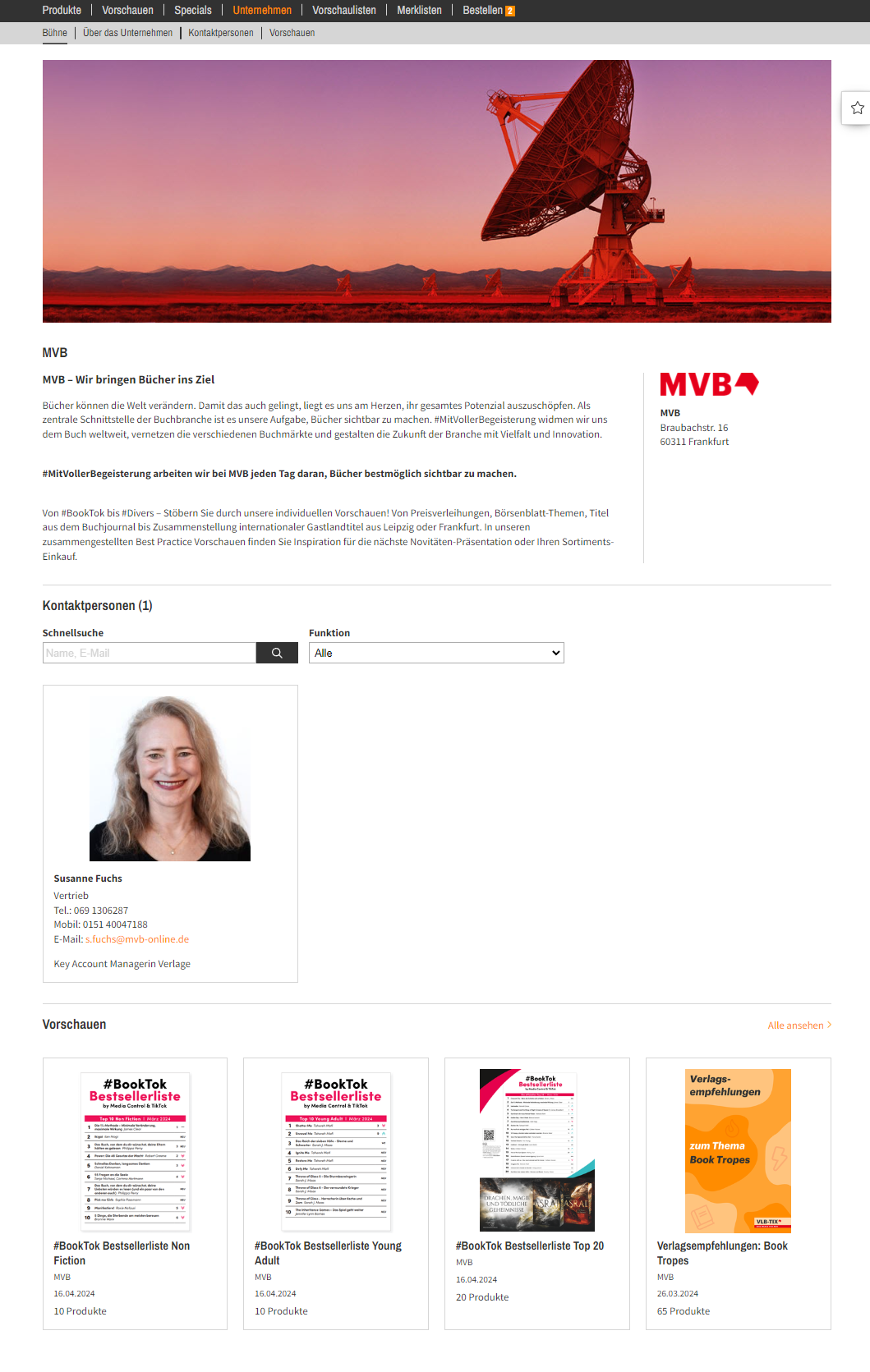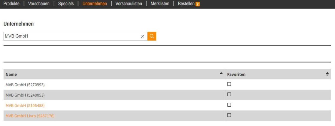 Unter dem Menüpunkt Unternehmen finden Sie alle aktiven Verlage, Buchhandelsgemeinschaften und Vertriebskooperationen. Hier können Sie:
